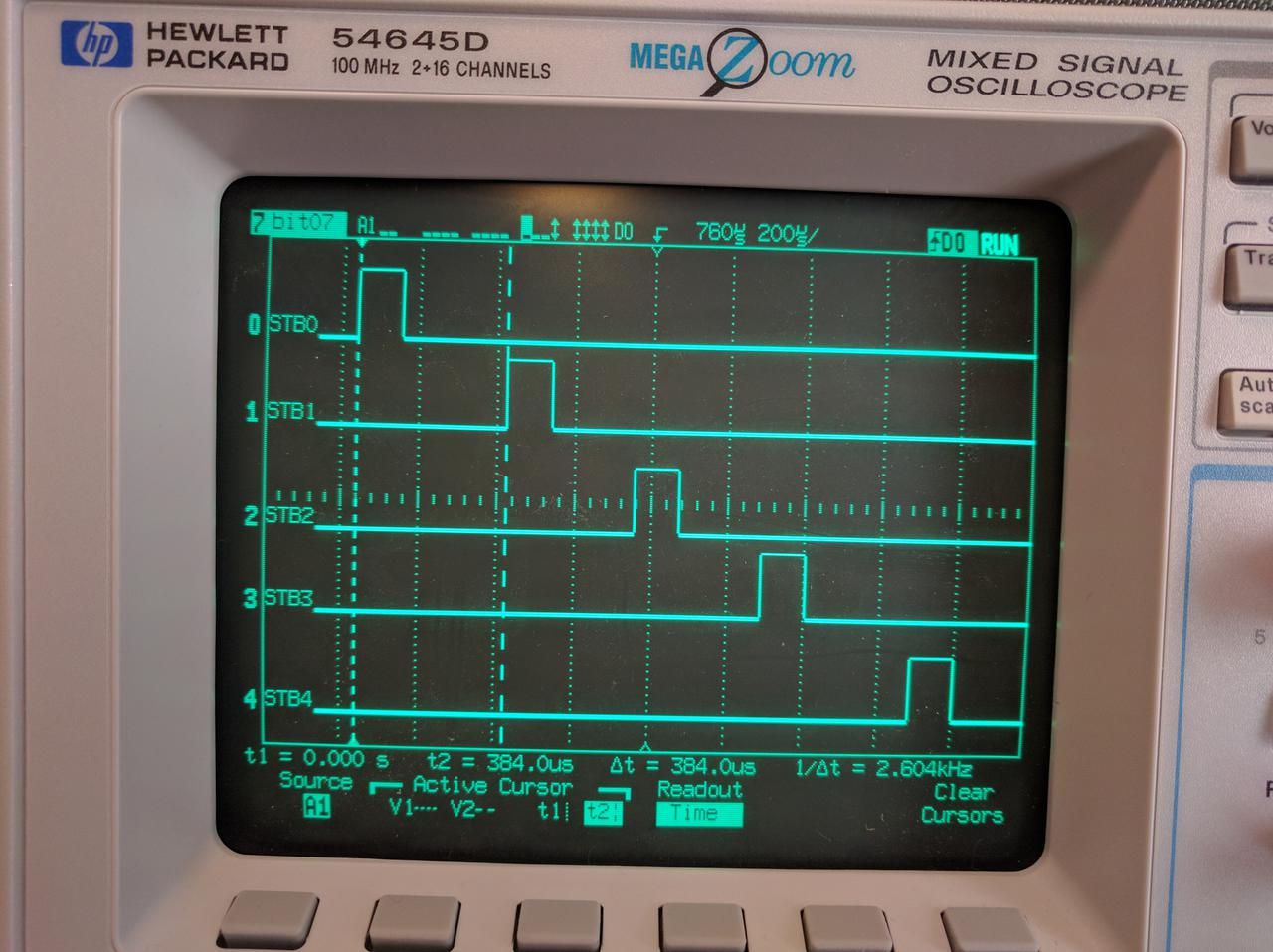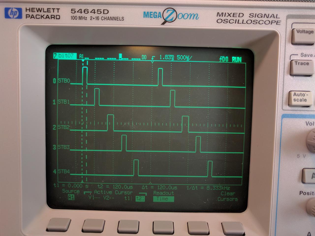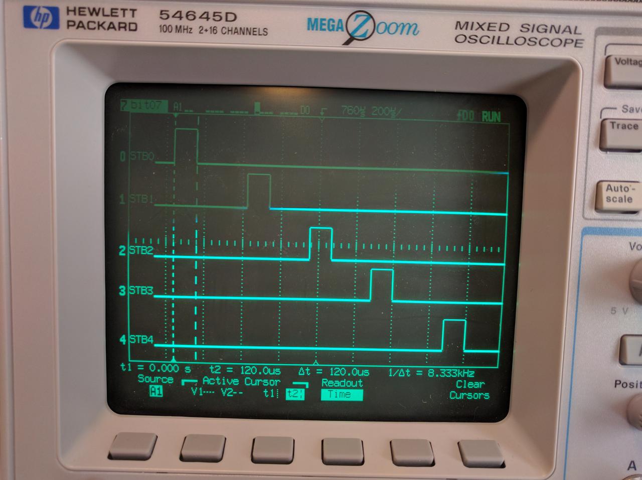 When a new update is ready, the Fluke's CPU updated 5 digits on the display by clocking out a 4-bit BCD digit value with a 130 microsecond wide positive-going strobe signal on each of the STB0 .. STB4 signals.