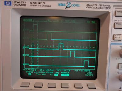 In this logic analyzer screen, you can see the once-per second activity on the strobe signals. It seems that the first set of 5 strobes "refreshes" the previous value, and then immediately afterwards, another set of 5 strobes clocks in the new value which is left on the display for one second.