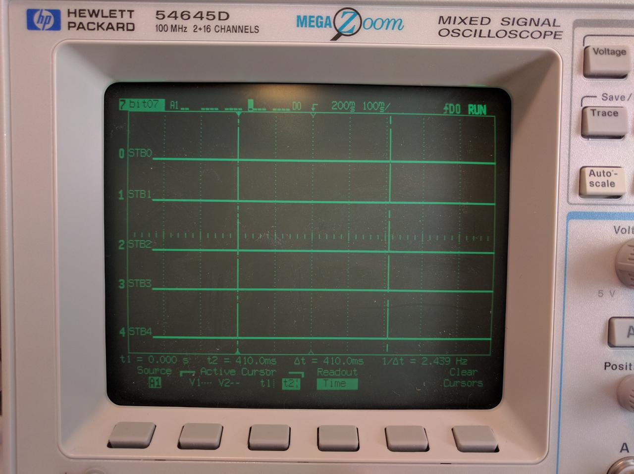 In this image, the timebase has been slowed down quite a bit, so that you cannot see the individual strobes, you can see the recurring 410 millisecond cycle of digit updates.