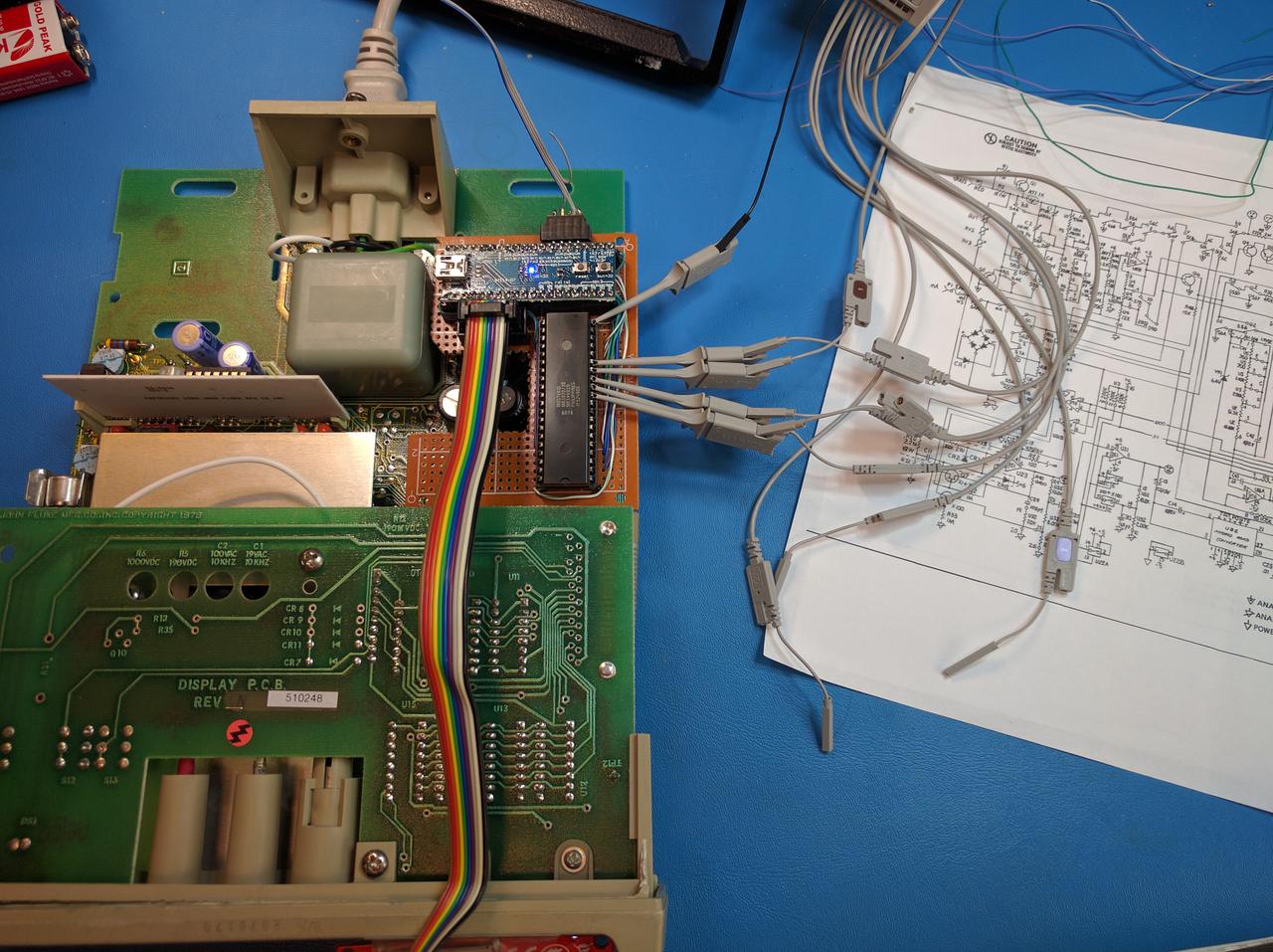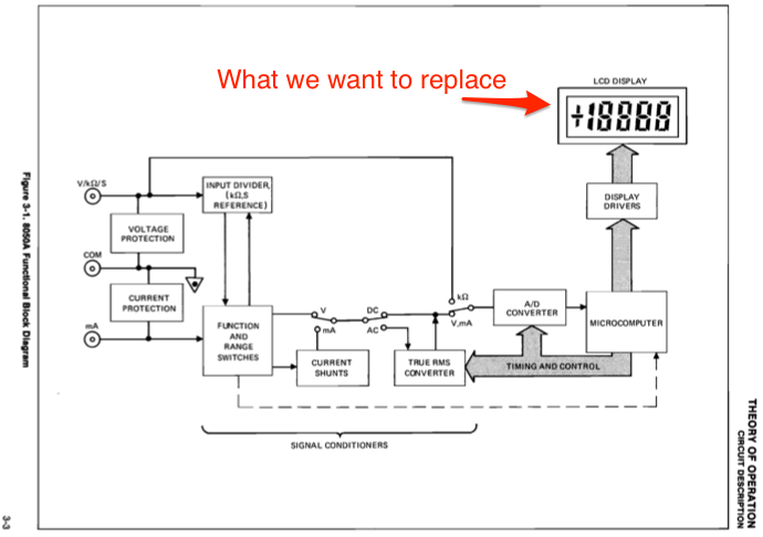 The micro also "eavesdrops" on the I/O pins of the Fluke 8050A multimeter's microcontroller, an MK3870 implementation of the F8 microprocessor architecture. The existing LCD display is operated using a combination of a 4 bit wide bus encoding the binary value of each digit as well as a number of strobe signals to select each of the 4 digits on the display. There are other signals that are used to control annunciators on the existing LCD for specific conditions (+/- sign, high voltage warning, etc.)