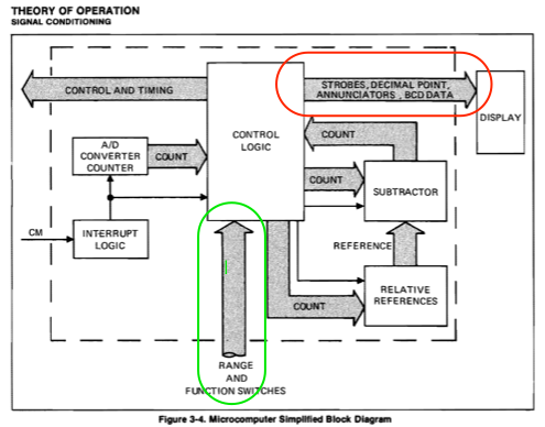 Looking closer, we can consider some of the signals involved in the operation of the multimeter. There are signals identified that drive the display, as well as other signals that are monitored to sense the mode and range that the meter is switched to.