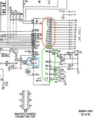 The signals circled in red relate to the signals driving the display, while the ones circled in green relate to the switches used to set the mode and range.